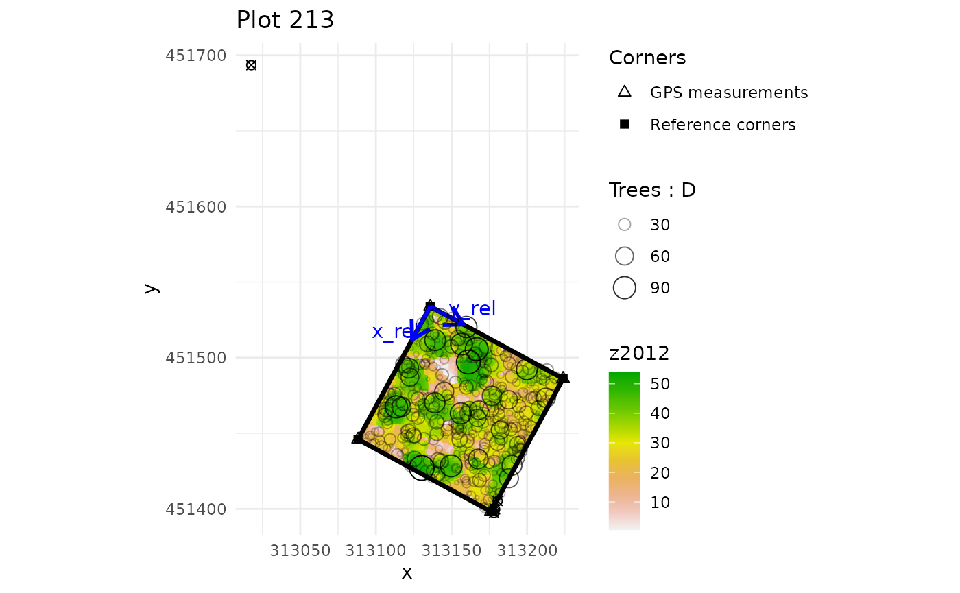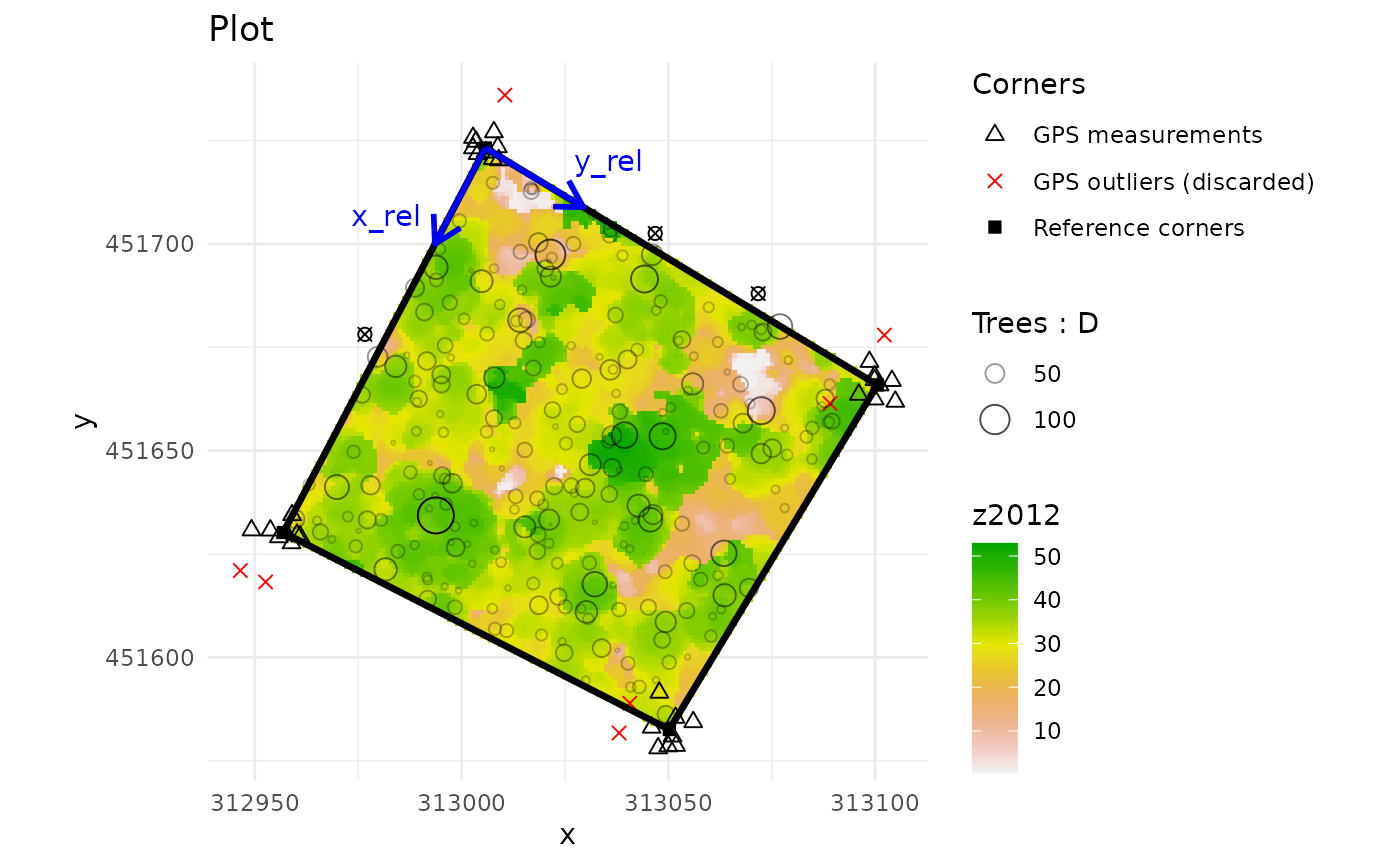 kable(check_plot_trust_GPS$corner_coord, row.names = FALSE, caption = "Reference corner coordinates")| x_rel | y_rel | x_proj | y_proj | long | lat |