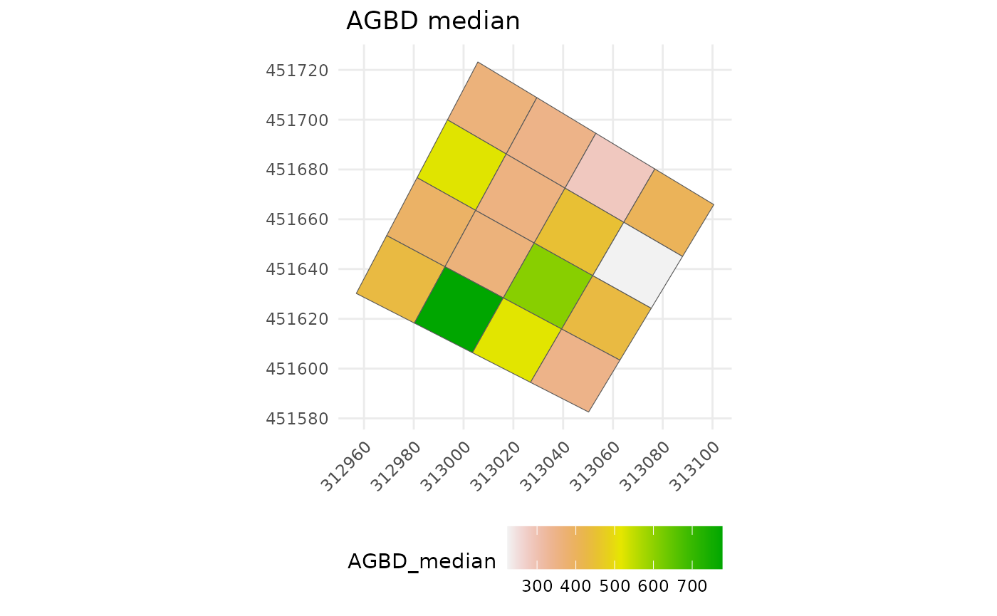 value = "D", fun = mean, per_ha = FALSE)Summarising the AGBD and its uncertainties
